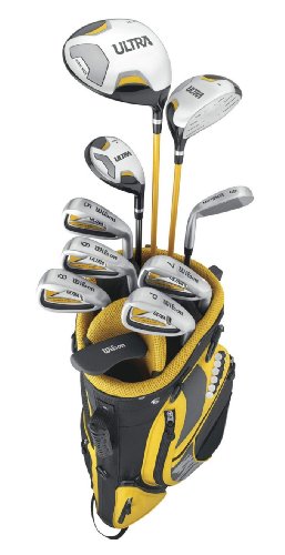 The Men's Wilson Ultra Golf Club Set for 2012 Includes: Matching Head Covers, Driver, Fairway Wood, # 4 Hybrid, (5 - PW) Irons, Putter, Auto Deploy Kick-Stand Bag w/ Double Shoulder Strap & Snap On Top Rain/Dust Cover! This set has everything needed to take your game to the next level! The large sweet-spot driver will provide plenty of distance off the tee, and the #4 hybrid eliminates the hassle of hitting long irons. The putter includes a steel shaft that produces consistent contact and feel, so you can finish the hole with confidence!