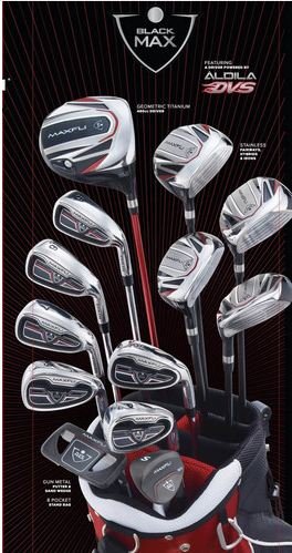 with Woods, Irons, Stand Bag, Sand Wedge and Putter - 19 pc Set - Low profile stainless 3 & 5 Woods have visable fixed weight technology delivering superior forgiveness and high launch (Hybrid Irons) - 3 & 4 Hybrid irons replace the hard-to-hit long irons by fusing together the technology of easier to hit woods and the accuracy of irons - The low profile hybrid irons also have heel/toe fixed weights keeping the center of gravity ""low and back"" for high launch ball flight - Graphite shafts provide stability on off-center hits resulting in more consistent shot making - Undercut 5-PW Stainless Irons with Steel Shafts - The Black Max irons are an undercut iron moving the center of gravity low for more distance and accuracy at impact - Stainless Steel construction ensures quality and durability - Vibration dampening medallion provides added feel - Black Max Gun Metal Putter - The Black Max perimeter weighted offset mallet putter provides high moment of inertia to reduce twisting and turning of club head on off-center hits - The top alignment marking helps to visualize a line to the target - Black Max Gun Metal Sand Wedge - Dual cambered sole allows for more versatility around the green - Deluxe Stand Bag with Club Organizer Top - 8 total pockets includes fur-lined valuables pouch, ball pocket, large garment pocket, cell phone & glasses pocket, and cooler water bottle pocket. Also included is a towel clip, raincover and umbrella sleeve - Full-length dividers protect the graphite shafts, while the dual padded carry straps and club organizer top evenly distribute weight - Deluxe Long-Zip Headcovers - 3 & 5 Wood, 3 Hybrid and 4 Hybrid headcovers protect and prolong the finish of the clubheads and steel shafts