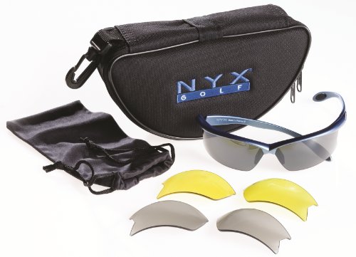 NYX Arrow Sunglass Traditional 3-Lens Set Ice Blue frame includes three interchangeable lenses. Dark Gray Deflector, Medium Gray Neutralizer and Yellow Luminator lens set. The Deflector uses a special, thin dielectric coating to provide crisp, clear vision while reflecting excessive visible light. Lens is ideal for play during hot mid-day conditions. The Neutralizer uses a neutral gray lens that minimizes color shift. Lighter tint than Deflector, this lens is especially suited for partly-cloudy days and for golfers that prefer to wear hats. The Luminator utilizes a yellow lens that blocks blue light and increases contrast to improve vision in low or flat light. This lens is perfect for playing late in the day, or in overcast conditions. Complete with carrying case and microfiber pouch. Available with prescription insert.