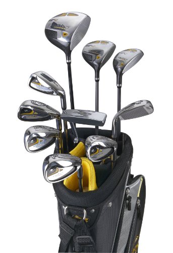 Beginners and intermediates can get their game off the ground in style with this full set from Golden Bear including a fairway wood hybrid cavity back irons and putter along with a sturdy stand bag.FEATURES: 460cc Ti-reinforced driver with ultralight graphite shaft. 3 Fairway wood. 4 Hybrid iron. 5-PW Stainless steel cavity back irons. Steel shafts on fairway wood hybrid and irons. Bear Claw Blade putter. All-weather rubber grips. Golden Bear stand bag. 2 Headcovers for driver and fairway wood.Cavity-Back TechnologyCavity-back technology redistributes the clubhead weight around the edges of the clubface creating a much more forgiving iron with a larger sweet spot. This makes them a perfect game improvement club that will play with you up to expert level.Golden Bear Golf EquipmentHave fun playing golf! That`s the Nicklaus promise with their Golden Bear Golf Equipment line. Featuring produ