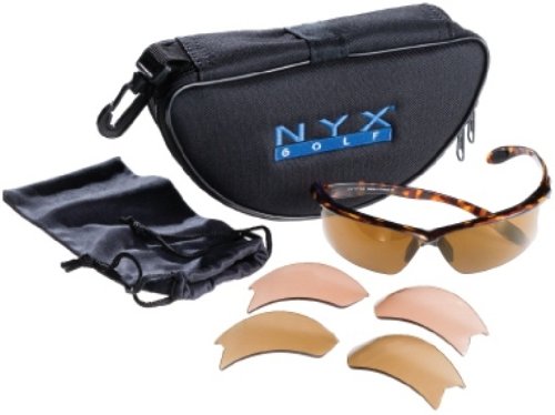 NYX Classic Competition 3-Lens Sunglass features a Traditional 3-Lens Set or Amber 3-Lens set. The Traditional series 3-Lens set includes Dark Gray Deflector , Medium Gray Neutralizer , and Yellow Luminator lens set. The Deflector uses a special, thin dielectric coating to provide crisp, clear vision while reflecting excessive visible light. Lens is ideal for play during hot mid-day conditions. The Neutralizer uses a neutral gray lens that minimizes color shift. Lighter tint than Deflector, this lens is especially suited for partly-cloudy days and for golfers that prefer to wear hats. The Luminator utilizes a yellow lens that blocks blue light and increases contrast to improve vision in low or flat light. This lens is perfect for playing late in the day, or in overcast conditions. The Amber 3-Lens Set: includes Dark Amber , Medium Amber Cinnamon and Light Rose . The Amber Series is designed to increase contrast and filter blue light. Includes carrying case and microfiber pouch. Available with prescription insert.